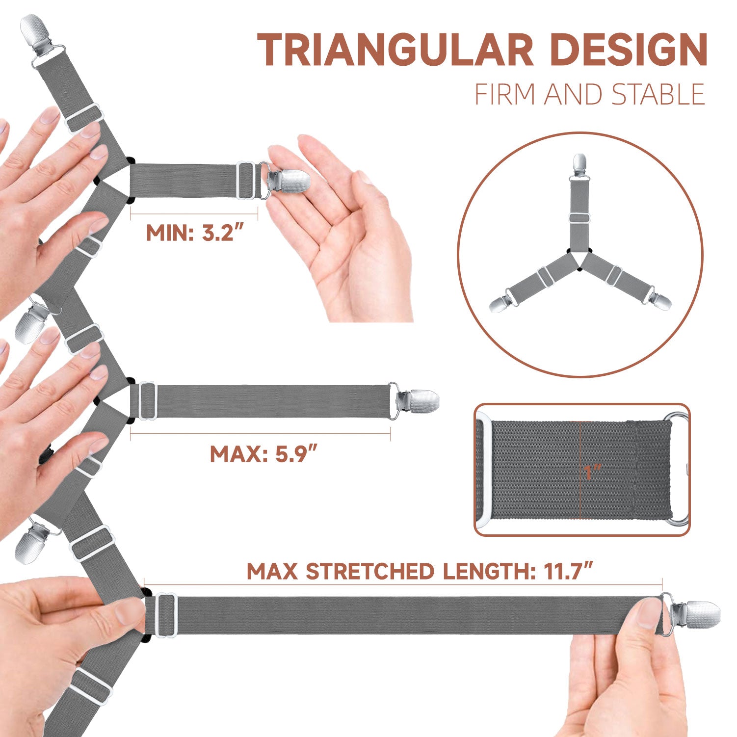 - Stable Triangle Design: The set includes 4 pcs triangle-shaped straps to securely hold each corner of your sheet in place, ensuring non-slip tidiness in your bed.