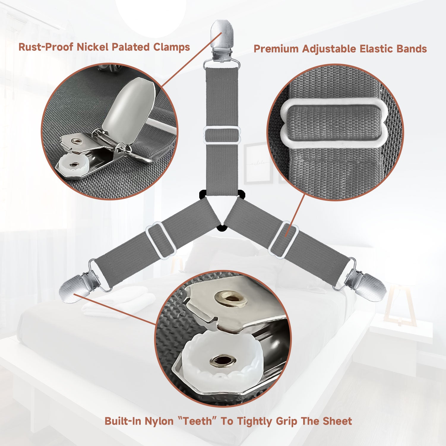 Bozenu Bed Sheet Straps, Upgrade Fitted Bed Sheet Holders for Corners, Non Slip Sheet Clips Grey 4Pcs